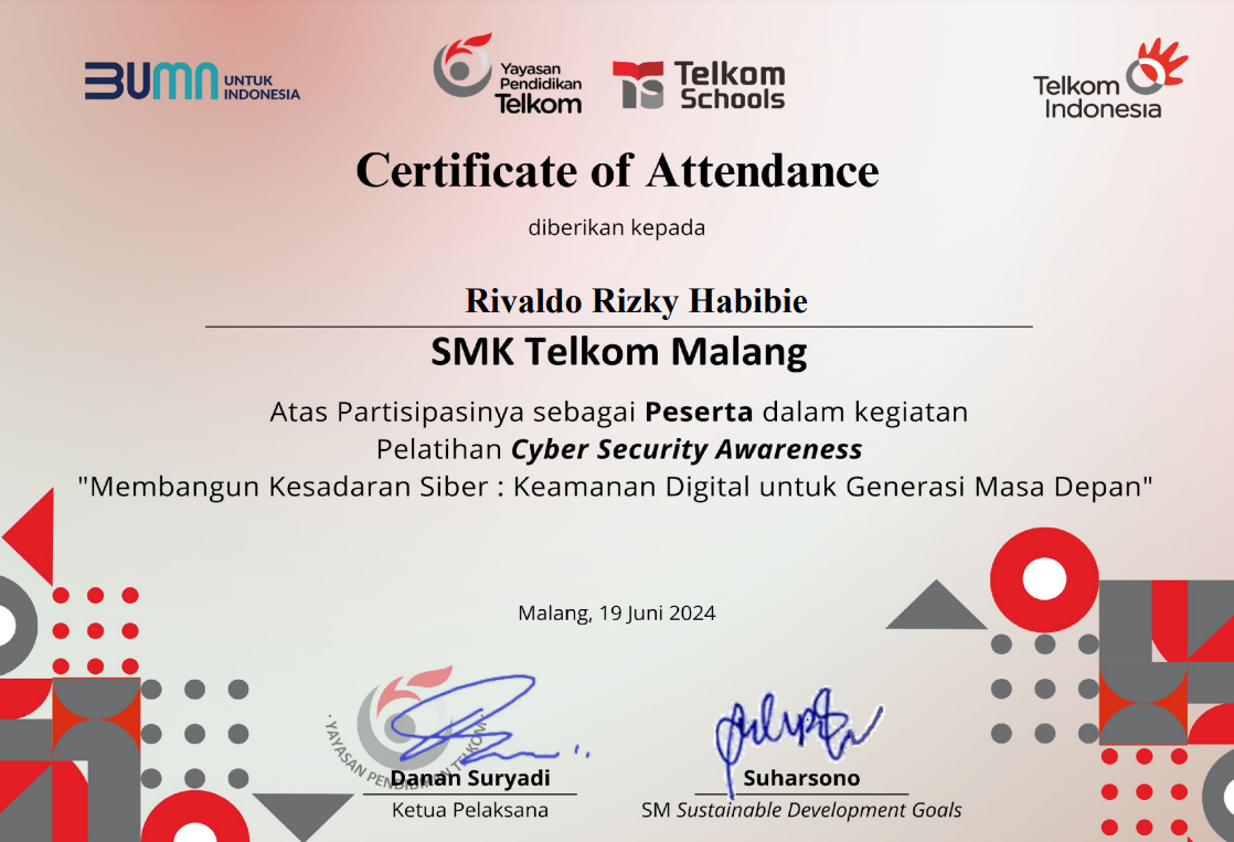 Sertifikat sebagai peserta webinar Cyber Security yang diadakan oleh Telkom Indonesia