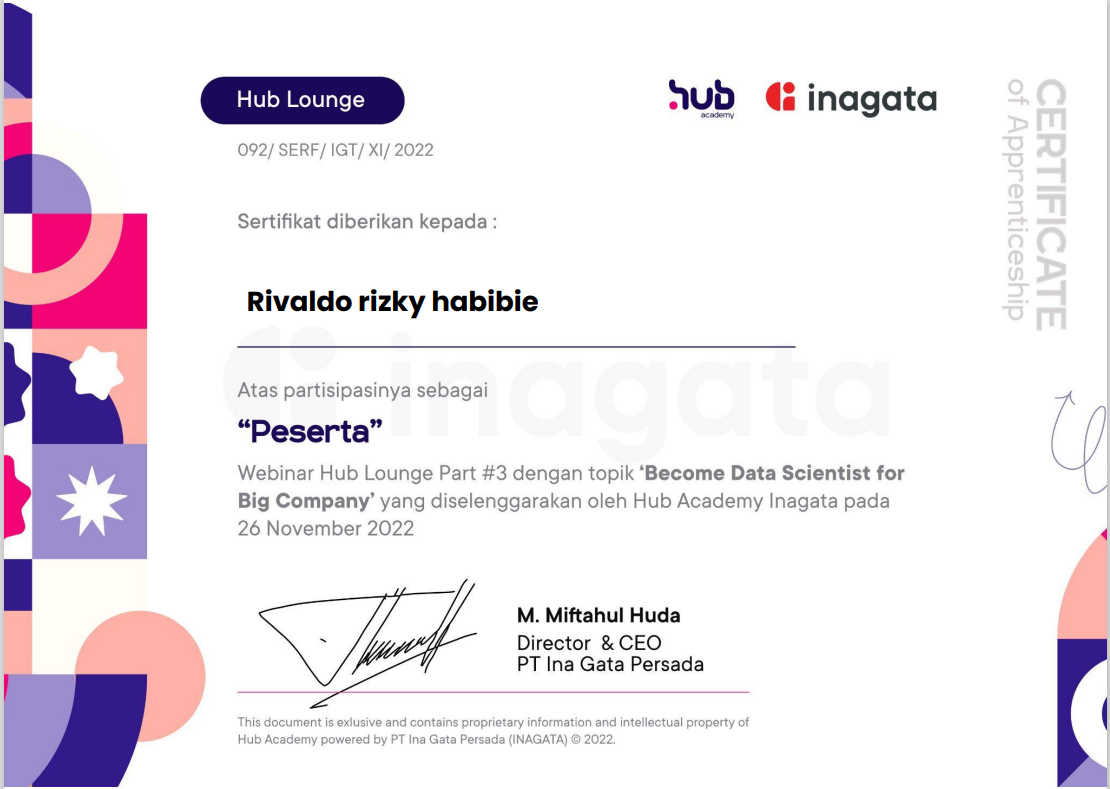 Sertifikat sebagai peserta webinar Data Science yang diadakan oleh Telkom Indonesia 2024.