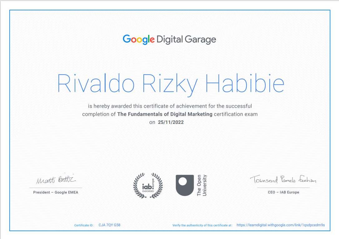 Sertifikat sebagai peserta program belajar digital marketing dari Google Digital Garage 2023.