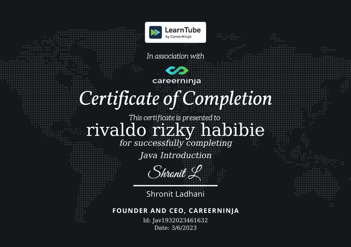 Sertifikat sebagai peserta program belajar Java Introduction dari LearnTube 2024.
