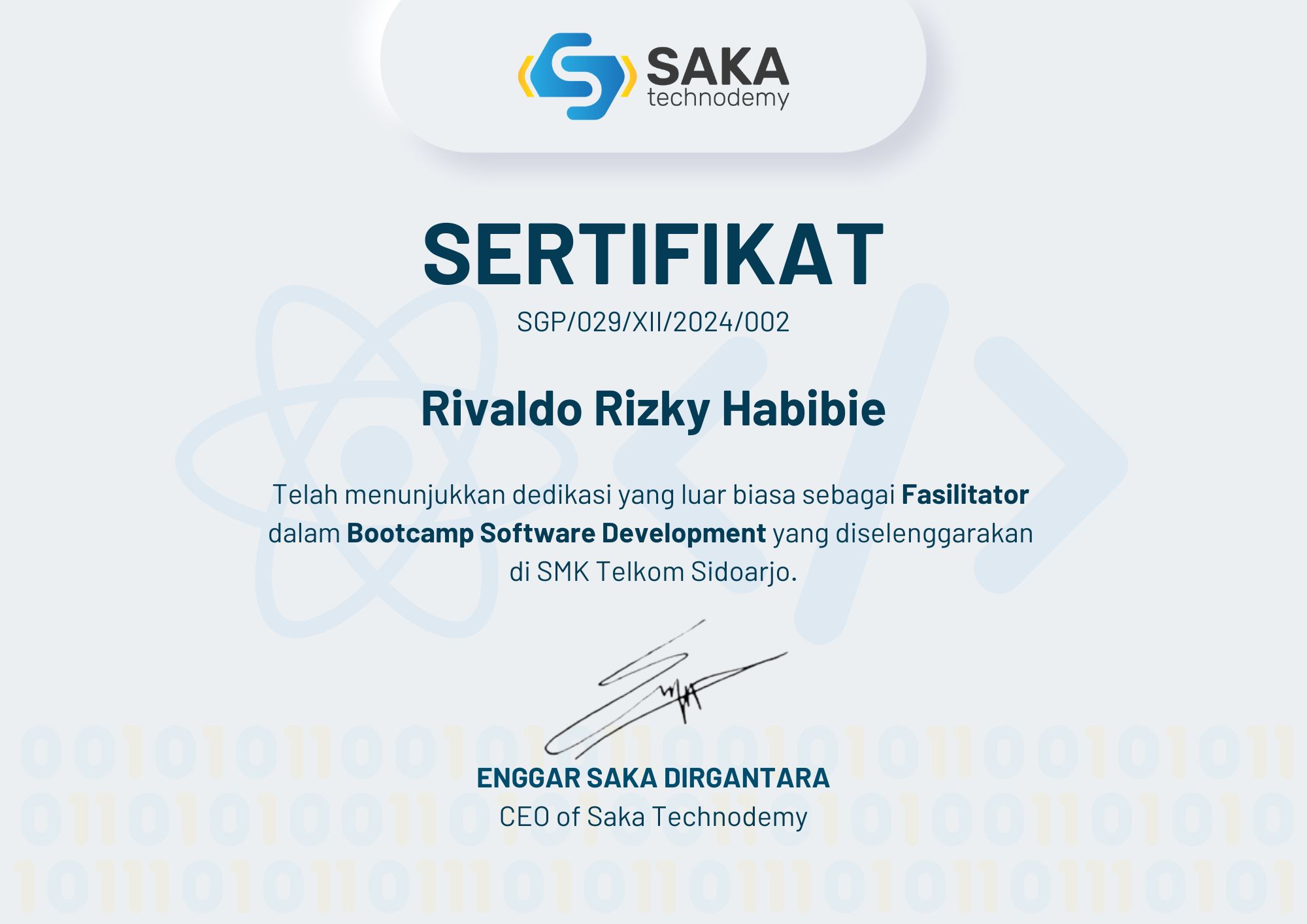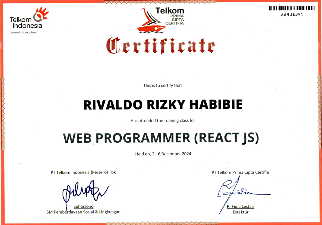 Sertifikat kelulusan program Web Programmer React yang diadakan oleh Telkom Indonesia 2025.