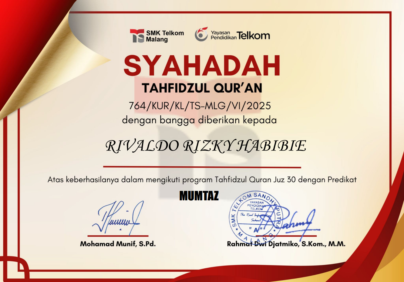 Sertifikat Tahfidz 30 Juz Al-Qur'an Mumtaz 2025.