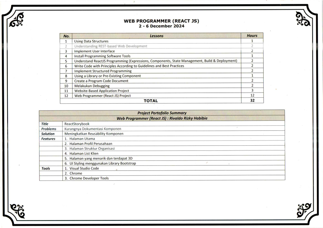 Sertifikat kelulusan program Web Programmer React yang diadakan oleh BNSP 2025.