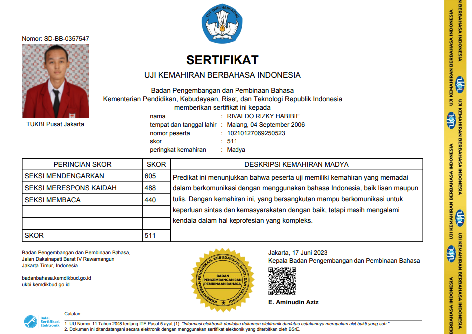 Sertifikat Uji Kemahiran Berbahasa Indonesia (UKBI) 2024.